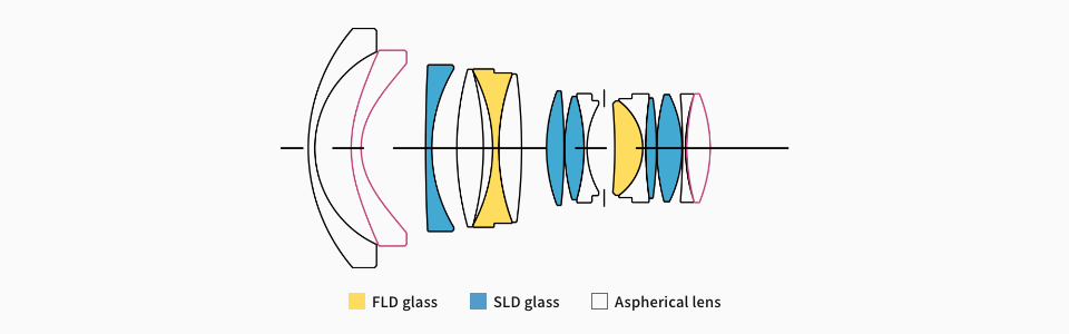 (*)FLD (“F” Low Dispersion) glass and five SLD (Special Low Dispersion) glass elements to minimize transverse chromatic aberration, which is mainly visible around the edge of the image. The optimized lens power distribution helps minimize axial chromatic aberration. As a result, this lens delivers high image quality in every situation without color smearing, and its rendering performance is consistently sharp with high contrast.