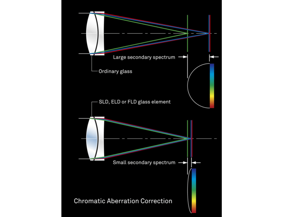 The degree to which light is refracted by glass depends on the light's wavelength. This fact causes different colors of light to focus at slightly different points. The result is chromatic aberration, the color fringing that is particularly noticeable in telephoto lenses. Most chromatic aberration can be removed by combining a high-refractivity convex lens element with a low-refractivity concave element. Yet residual chromatic aberration known as "secondary spectrum" may still remain. To minimize this secondary spectrum, which can be a serious issue with conventional lenses, SIGMA lenses feature up to three types of exclusive low-dispersion glass offering superior performance: ELD (Extraordinary Low Dispersion), SLD (Special Low Dispersion) and FLD ("F" Low Dispersion). In particular, FLD glass offers ultra-low dispersion in combination with high transmittance and the anomalous dispersion characteristics of fluorite. Meticulous deployment of these types of exclusive low-dispersion glass and optimization of power distribution gives SIGMA lenses superlative image rendition undiminished by residual chromatic aberration.