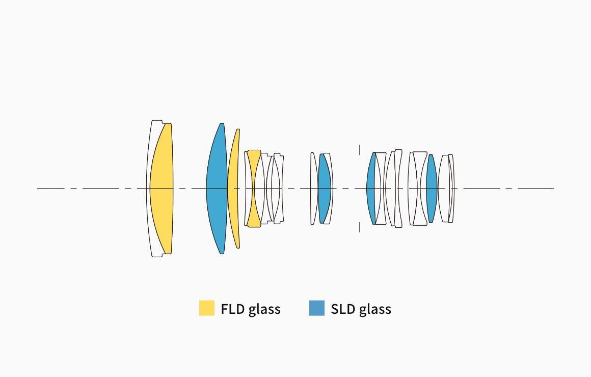 To help minimize axial and transverse chromatic aberration, this lens features an optimal arrangement of three (*)FLD (“F” Low Dispersion) glass