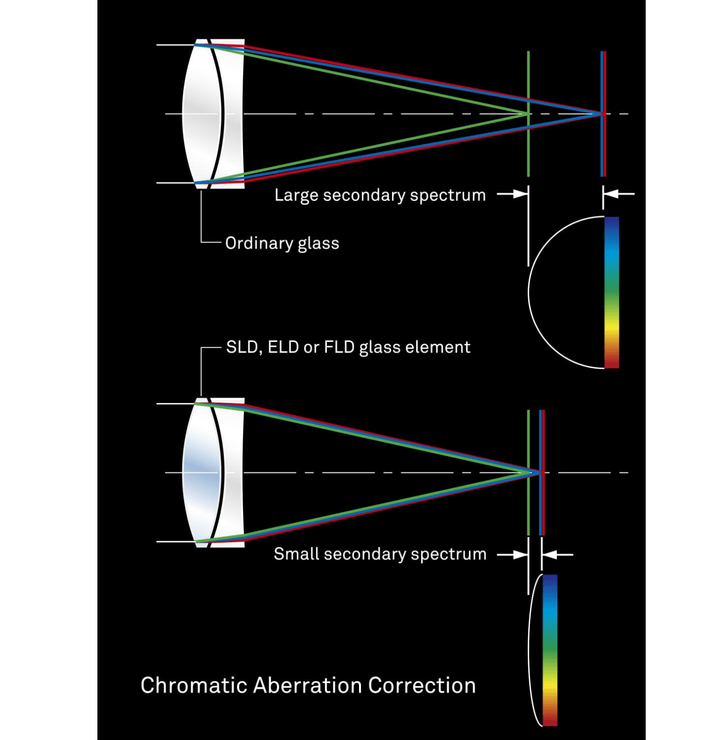 The degree to which light is refracted by glass depends on the light's wavelength. This fact causes different colors of light to focus at slightly different points. The result is chromatic aberration, the color fringing that is particularly noticeable in telephoto lenses. Most chromatic aberration can be removed by combining a high-refractivity convex lens element with a low-refractivity concave element. Yet residual chromatic aberration known as "secondary spectrum" may still remain. To minimize this secondary spectrum, which can be a serious issue with conventional lenses, SIGMA lenses feature up to three types of exclusive low-dispersion glass offering superior performance: ELD (Extraordinary Low Dispersion), SLD (Special Low Dispersion) and FLD ("F" Low Dispersion). In particular, FLD glass offers ultra-low dispersion in combination with high transmittance and the anomalous dispersion characteristics of fluorite. Meticulous deployment of these types of exclusive low-dispersion glass and optimization of power distribution gives SIGMA lenses superlative image rendition undiminished by residual chromatic aberration.
